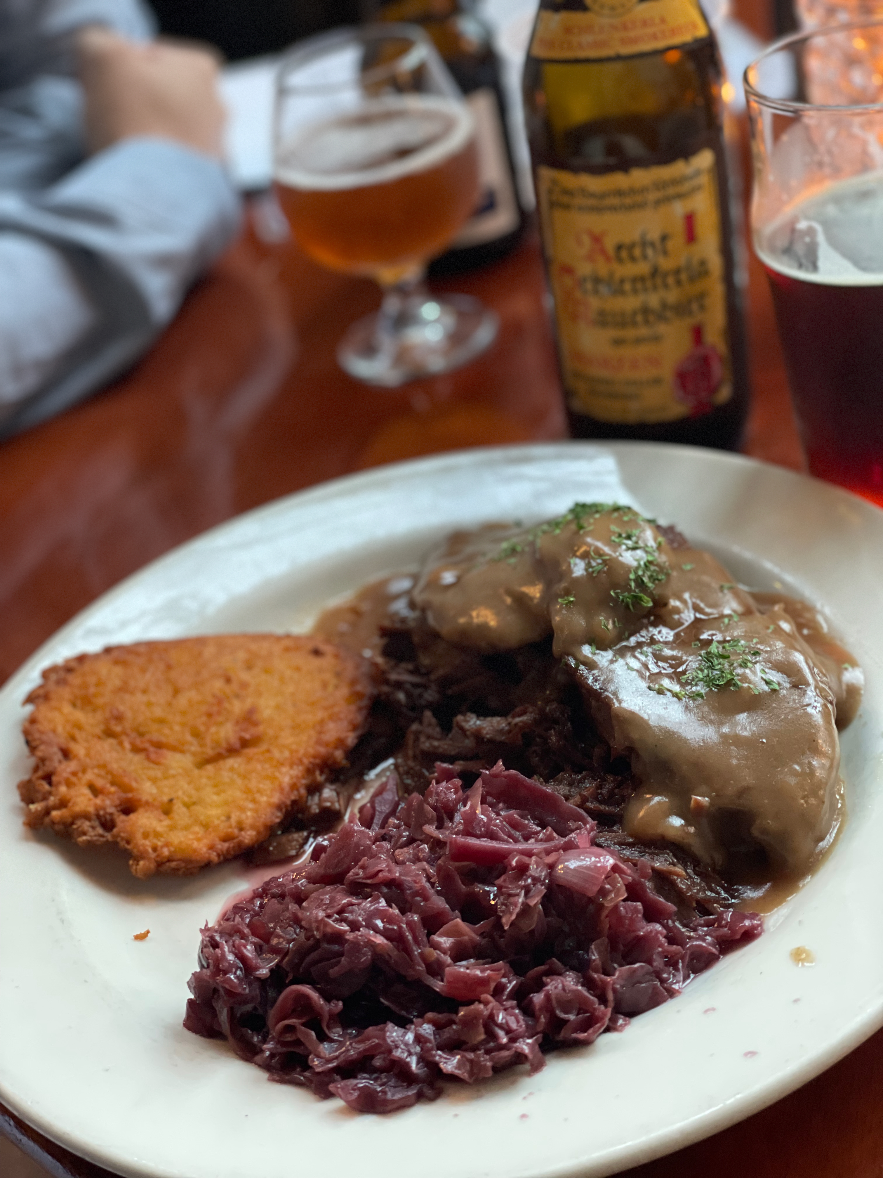 The food menu is massive and eclectic. I chose to get the Jaegerschnitzel (schnitzel, or pork loin cutlet, sauced with a mushroom gravy) with the spaetzle and german potato salad. Ryan got the Sauerbraten (5-day marinated beef roast) with the purple cabbage and potato pancake. Both entrees were phenomenal, but I’d say the german potato salad was the star side item. It all felt like good home cooking, even though I’ve never been to Germany.