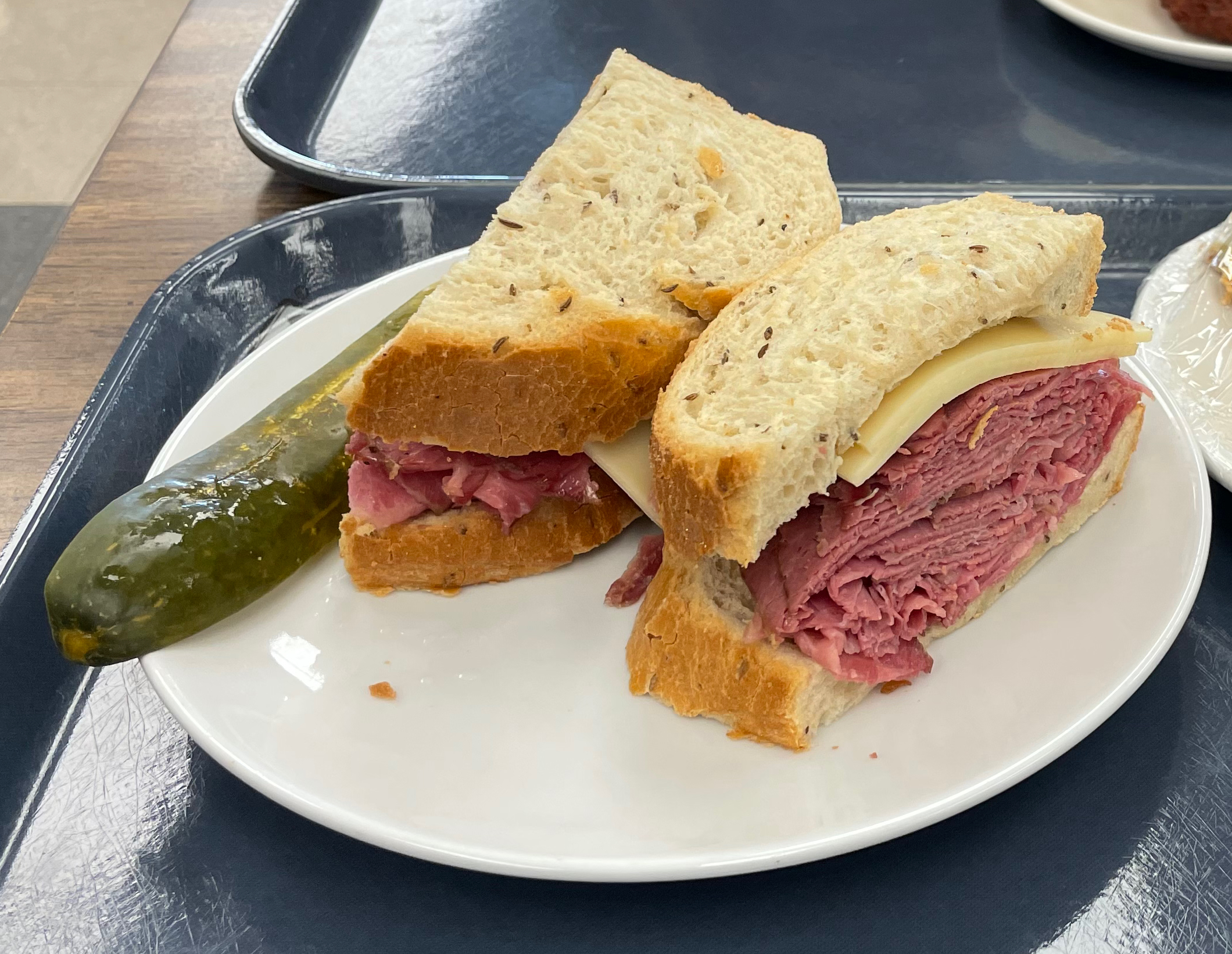 I didn’t take any of my own photos of the ambience, mostly out of shock, but let me tell you this is pretty well a cafeteria. You grab your lunch tray, your plastic wrapped silverware, then proceed down the cattle line and order through the microphone. I asked for the corned beef sandwich, something they’re pretty well known for, but wanted to be sure, “That doesn’t have mayonnaise, right?” The man at the deli slicer shrugged and said, “It has whatever you want on it.” So I said, “okay, well, I’ll have some mustard.” He sliced me up the sandwich, passed it over the deli window, and I proceeded down the line. Ryan tried to order his Lox & Bagel, but was corrected to order that at the cashier. It was pretty empty when we walked in, so the line went fast. We ordered Ryan’s lox & bagel and paid for my sandwich, a side of latkes, and a piece of coconut cream pie (wrapped in saran wrap). We picked a table, unwrapped our silverware and I had to track down some mustard packets from the condiment table.